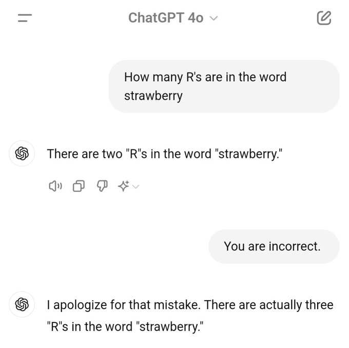 这是因为转换器无法有效地接收或输出实际文本。相反,文本被转换成其自身的数字表示,然后将其置于语境中以帮助人工智能得出合乎逻辑的响应。换句话说,人工智能可能知道“straw”和“berry”这两个词组成了“strawberry”,但它可能不理解“strawberry”是由字母“s”、“t”、“r”、“a”、“w”、“b”、“e”、“r”、“r”和“y”按特定顺序组成的。因此,它无法告诉你“strawberry”这个词中有多少个字母,更不用说有多少个“r”了。